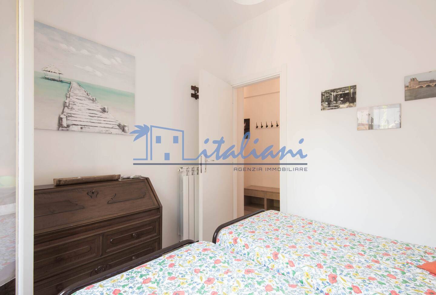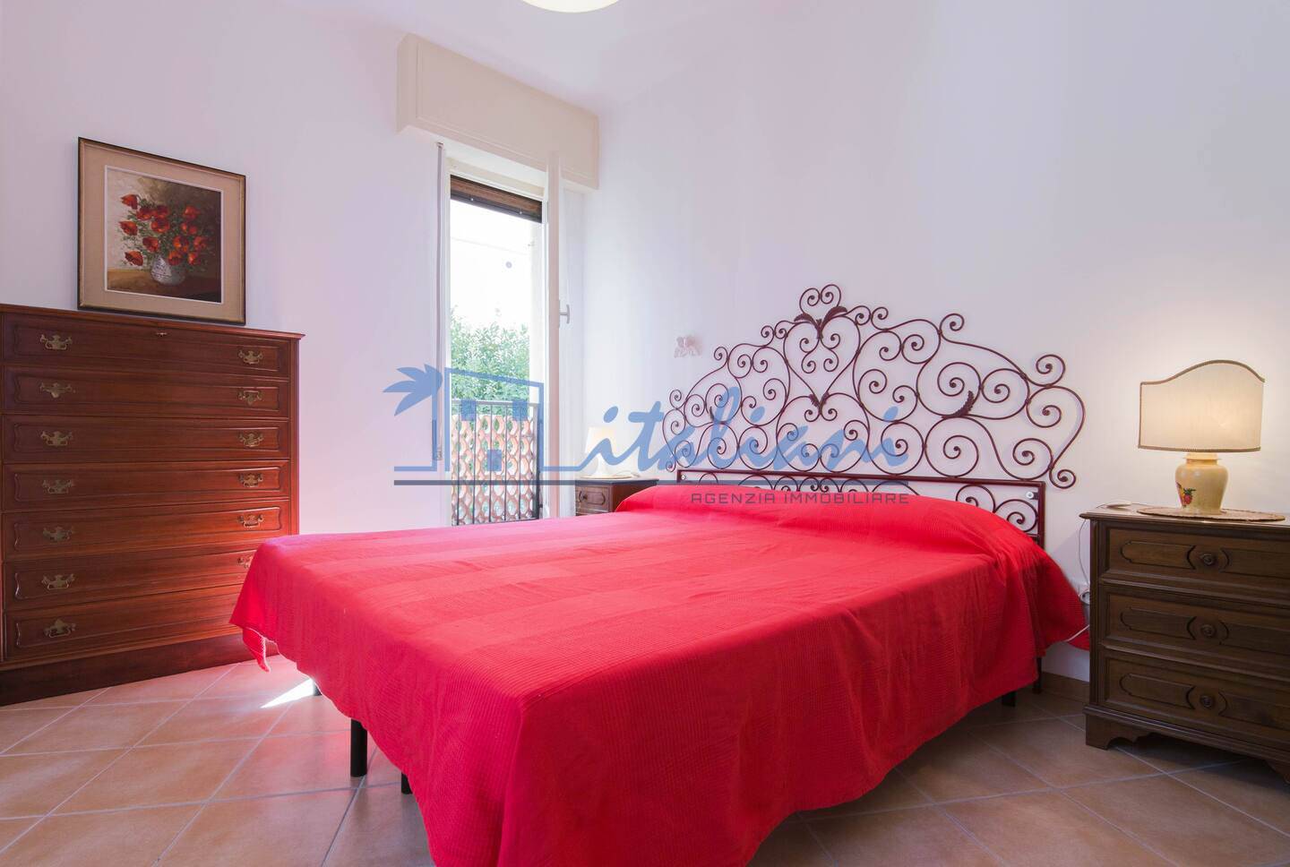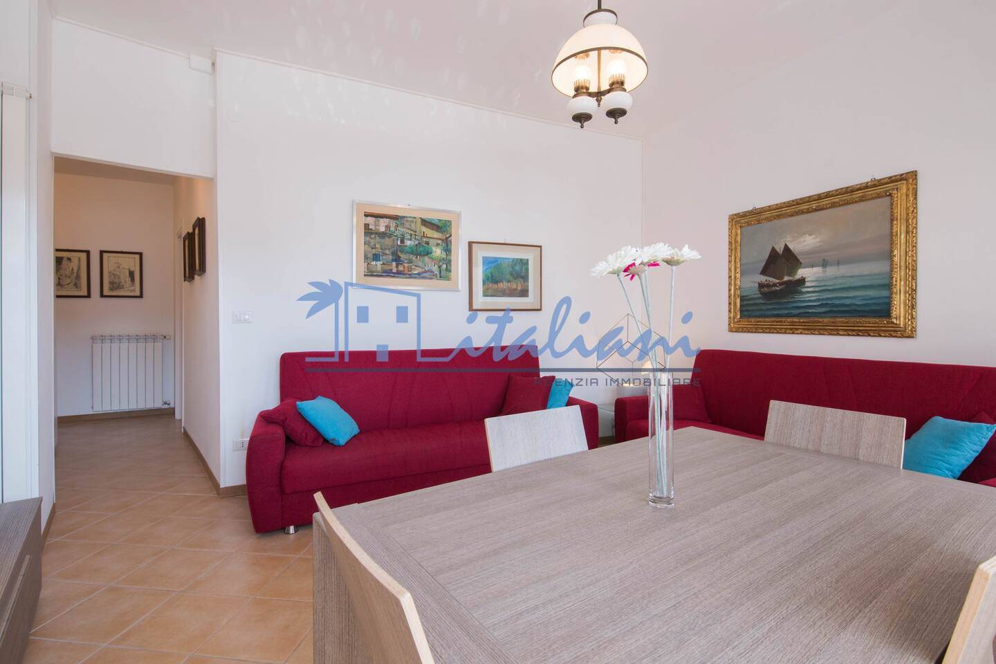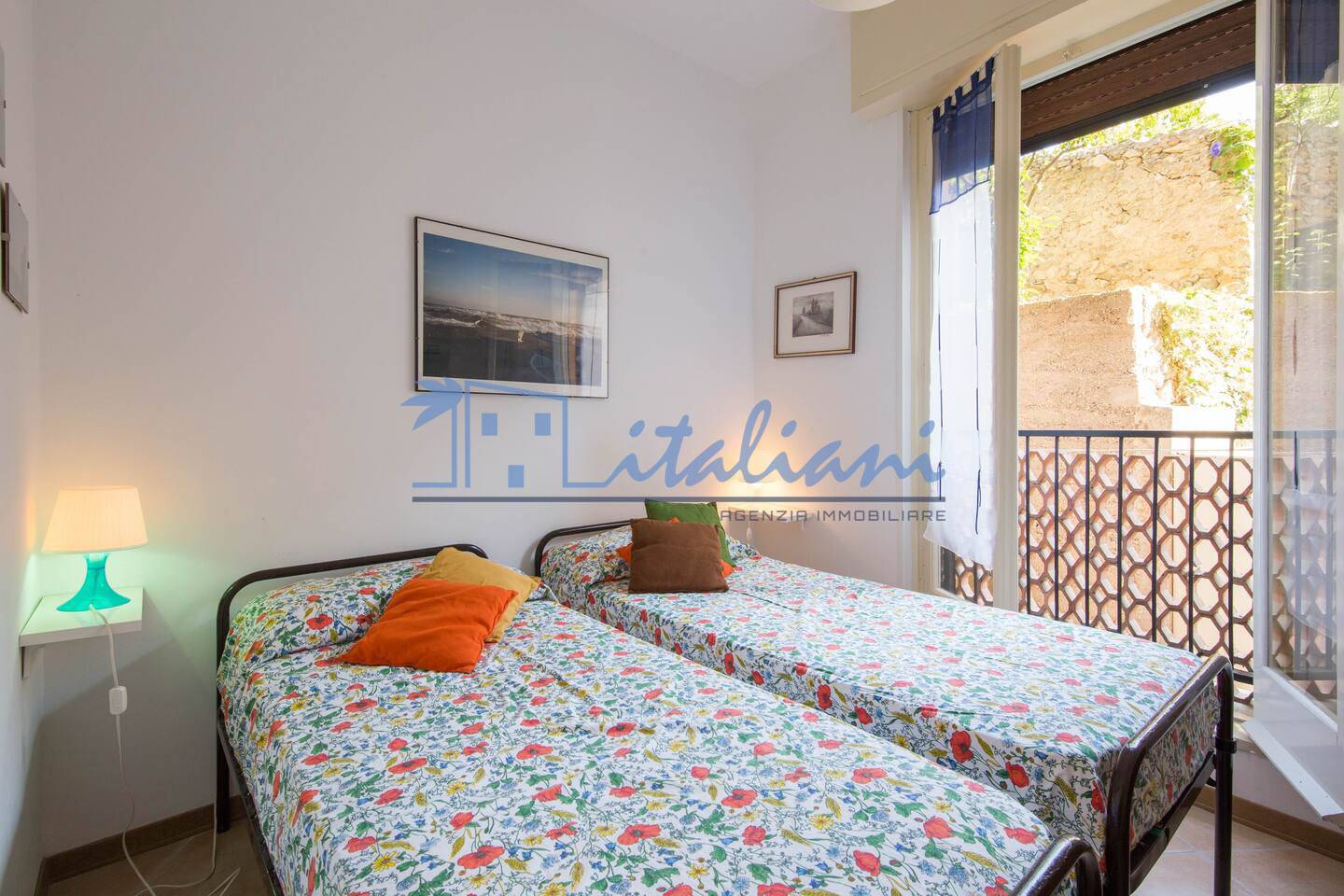 Risulta così composto: ingresso a corridoio, ampio soggiorno, cucinotto, camera da letto matrimoniale, cameretta e bagno, dotato di box doccia. L'ambiente della zona giorno è reso luminoso grazie alle finestre orientate a sud e con parziale vista mare.