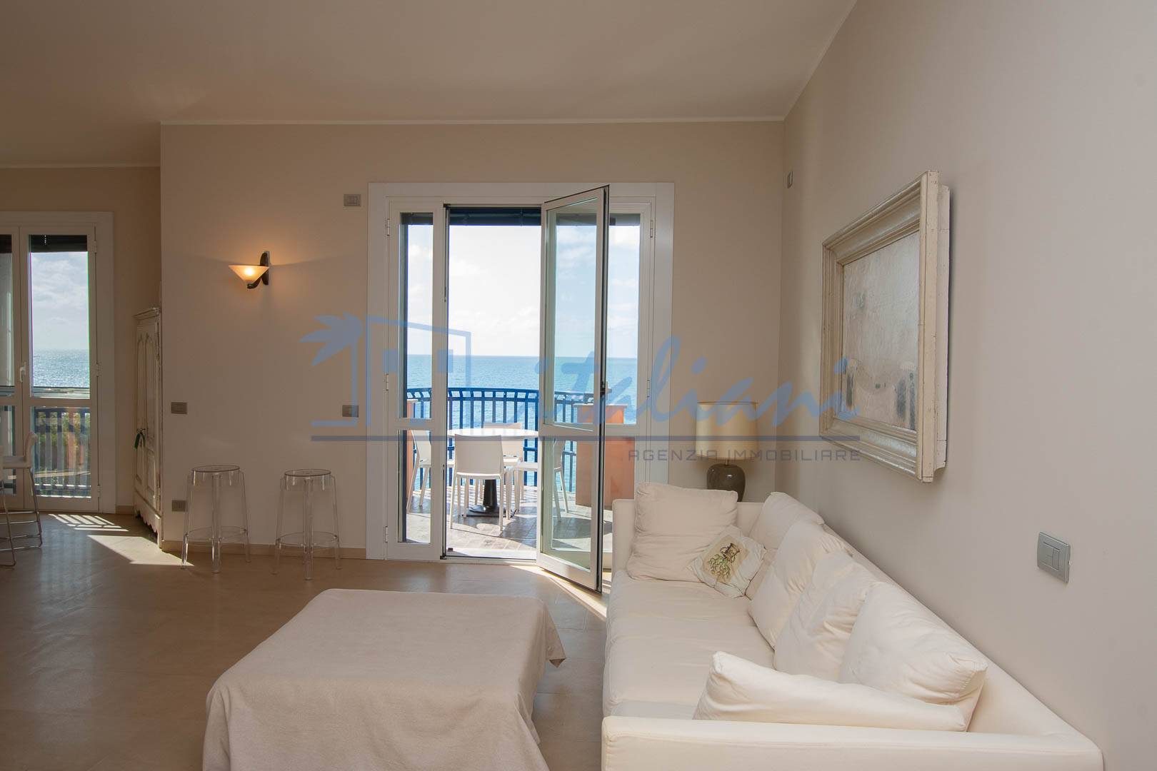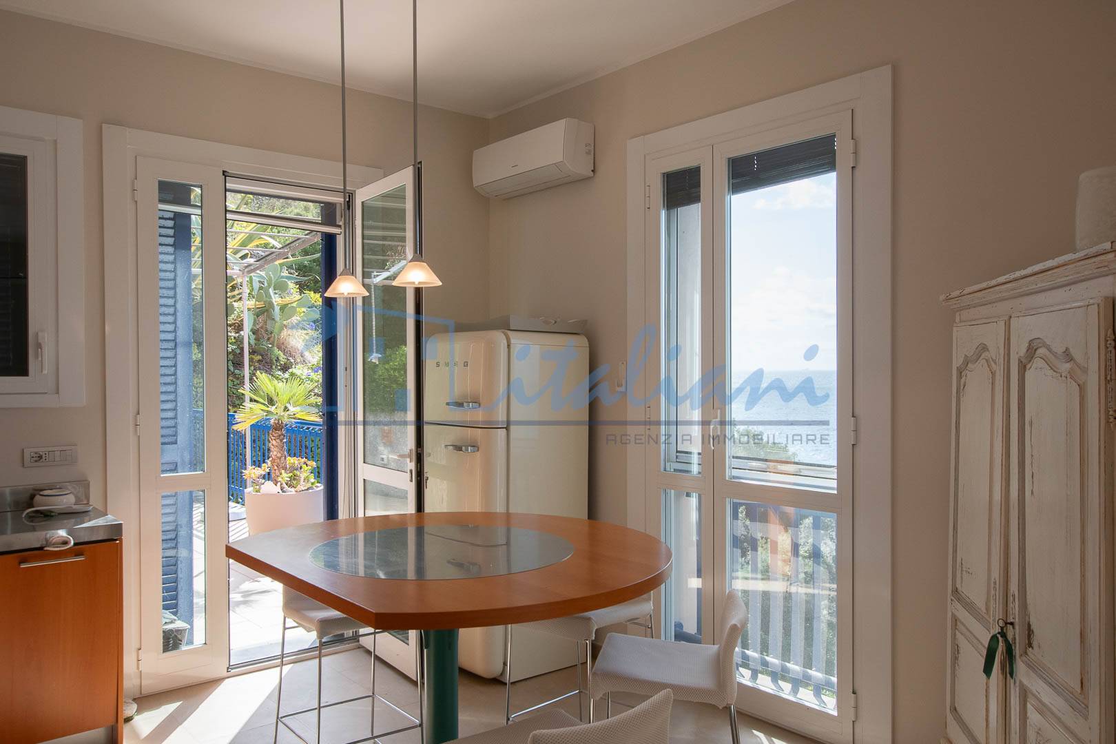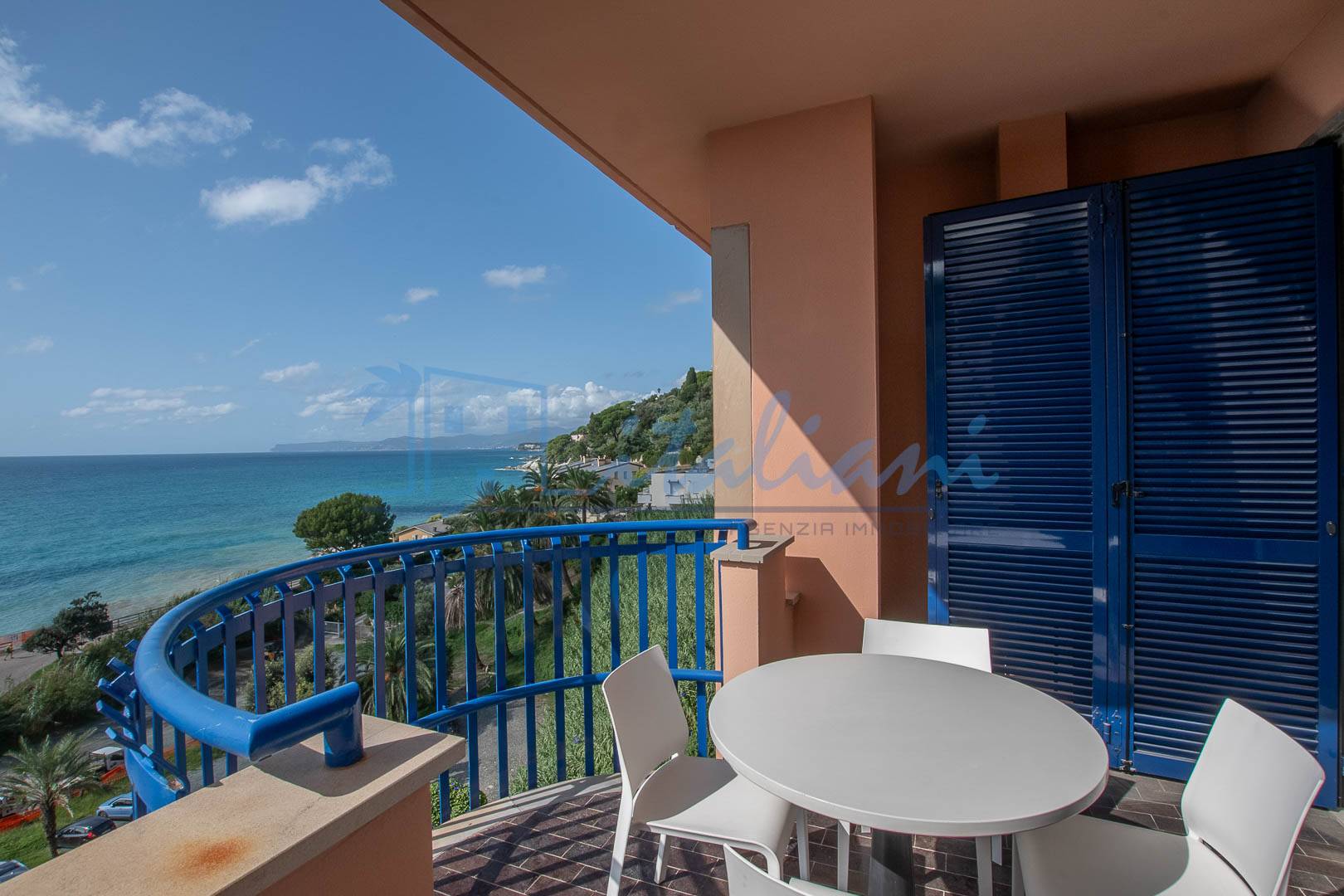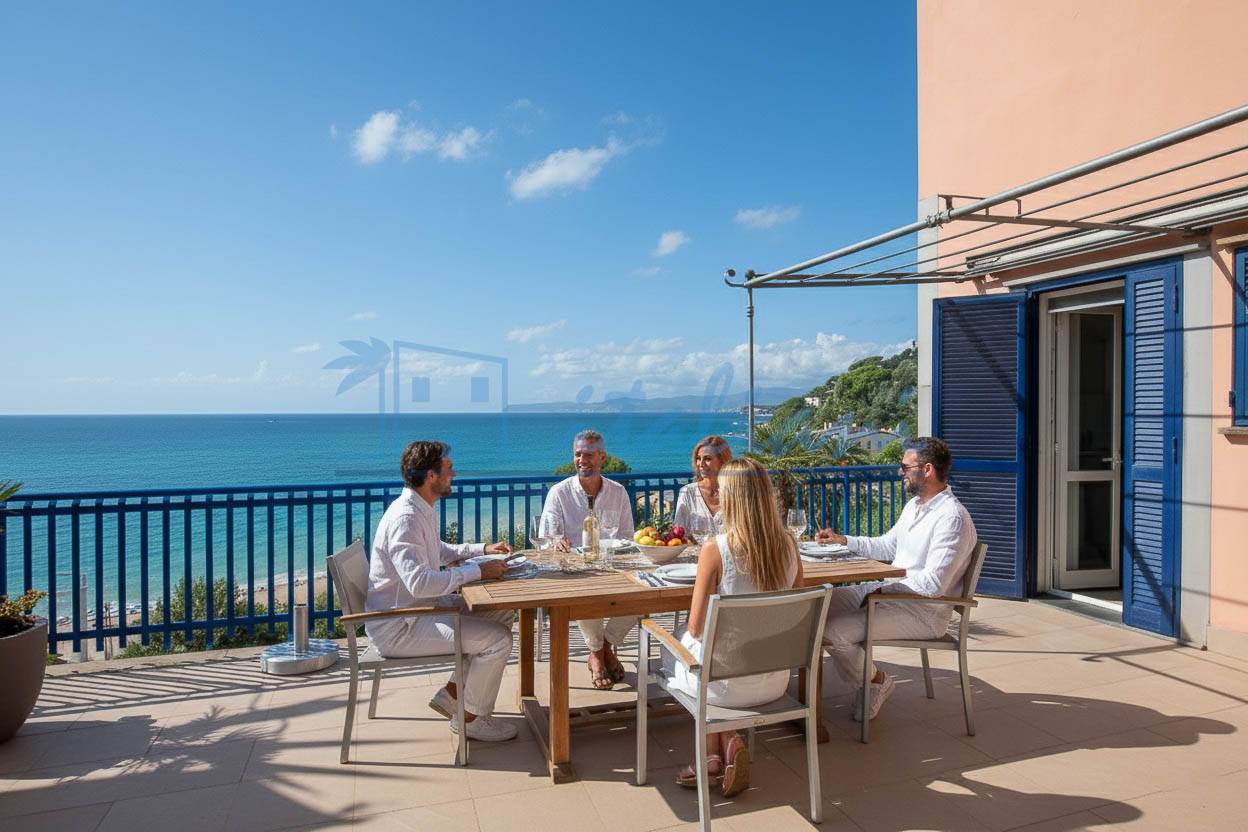 L'Appartamento è stato recentemente e finemente ristrutturato. E' composto da un ingresso che affaccia su di un ampio e luminoso soggiorno con zona cucina a vista e una zona pranzo da cui, attraverso le ampie finestre, si può godere una straordinaria vista sul mare. Proseguendo si trova la zona notte, composta da tre camere da letto: la prima, spaziosa, molto spaziosa, ha accesso sulla terrazza ed è dotata di bagno privato; le altre due, anch'esse matrimoniali ma di una dimensione leggermente più contenuta, affacciano sul retro del condominio ed in particolare sul giardino condominiale. A completare secondo bagno finestrato.