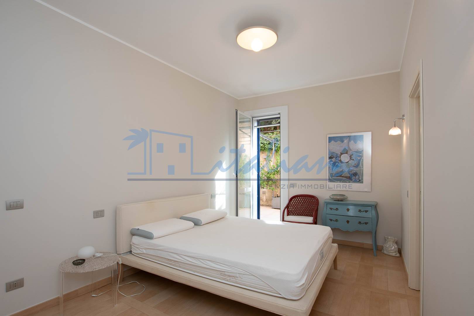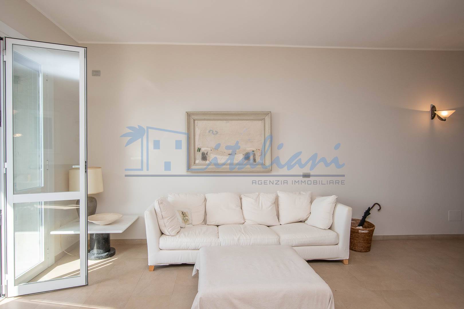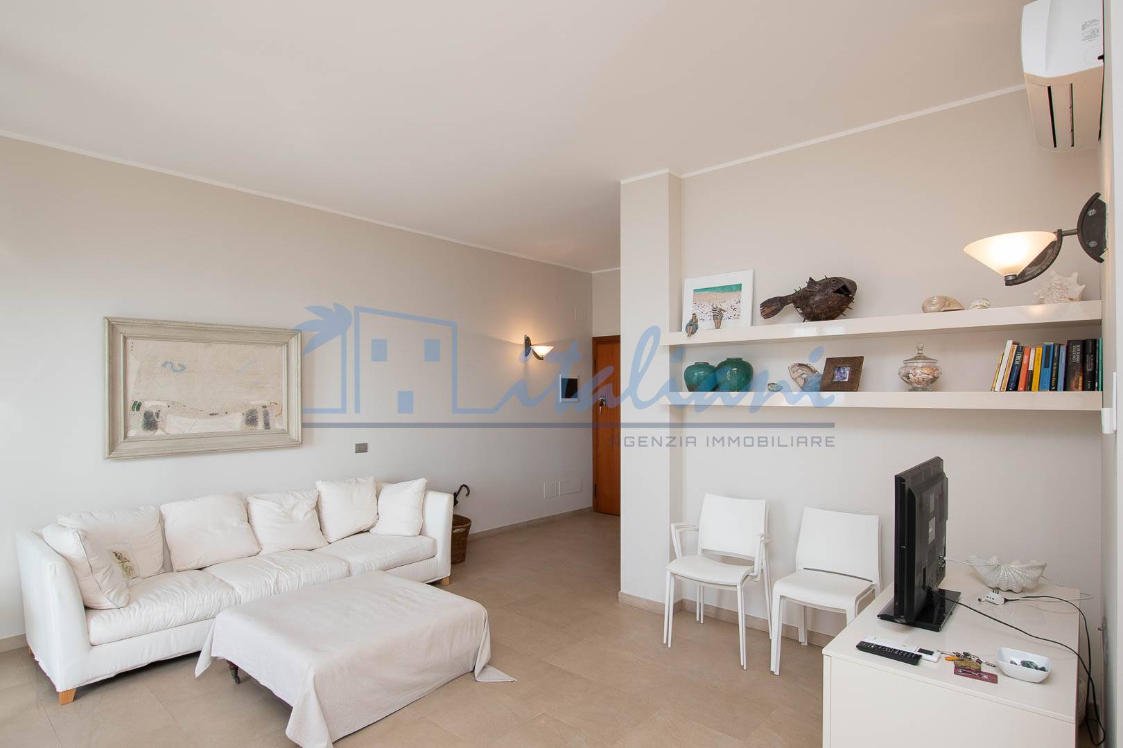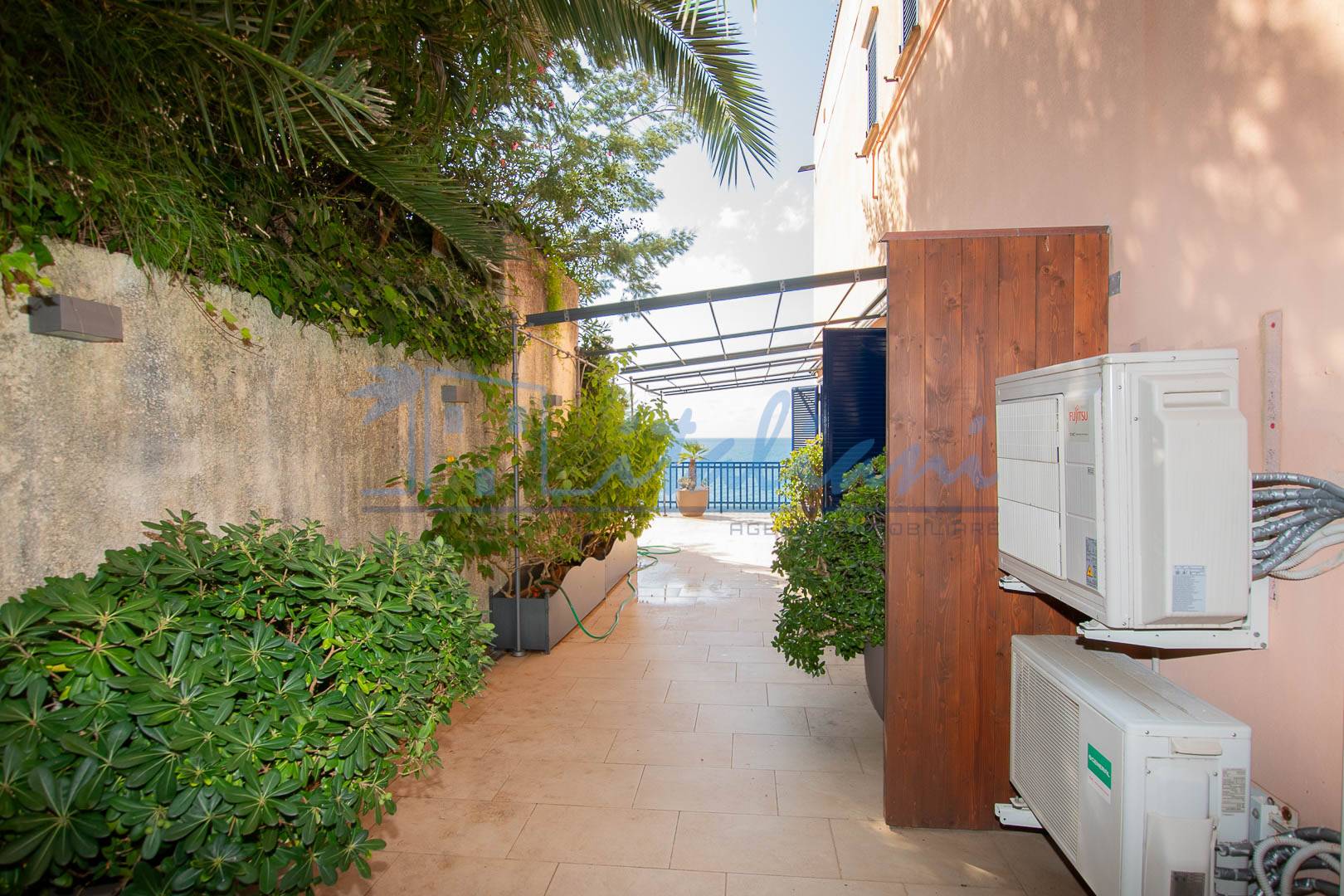 L'Appartamento è stato recentemente e finemente ristrutturato. E' composto da un ingresso che affaccia su di un ampio e luminoso soggiorno con zona cucina a vista e una zona pranzo da cui, attraverso le ampie finestre, si può godere una straordinaria vista sul mare. Proseguendo si trova la zona notte, composta da tre camere da letto: la prima, spaziosa, molto spaziosa, ha accesso sulla terrazza ed è dotata di bagno privato; le altre due, anch'esse matrimoniali ma di una dimensione leggermente più contenuta, affacciano sul retro del condominio ed in particolare sul giardino condominiale. A completare secondo bagno finestrato.