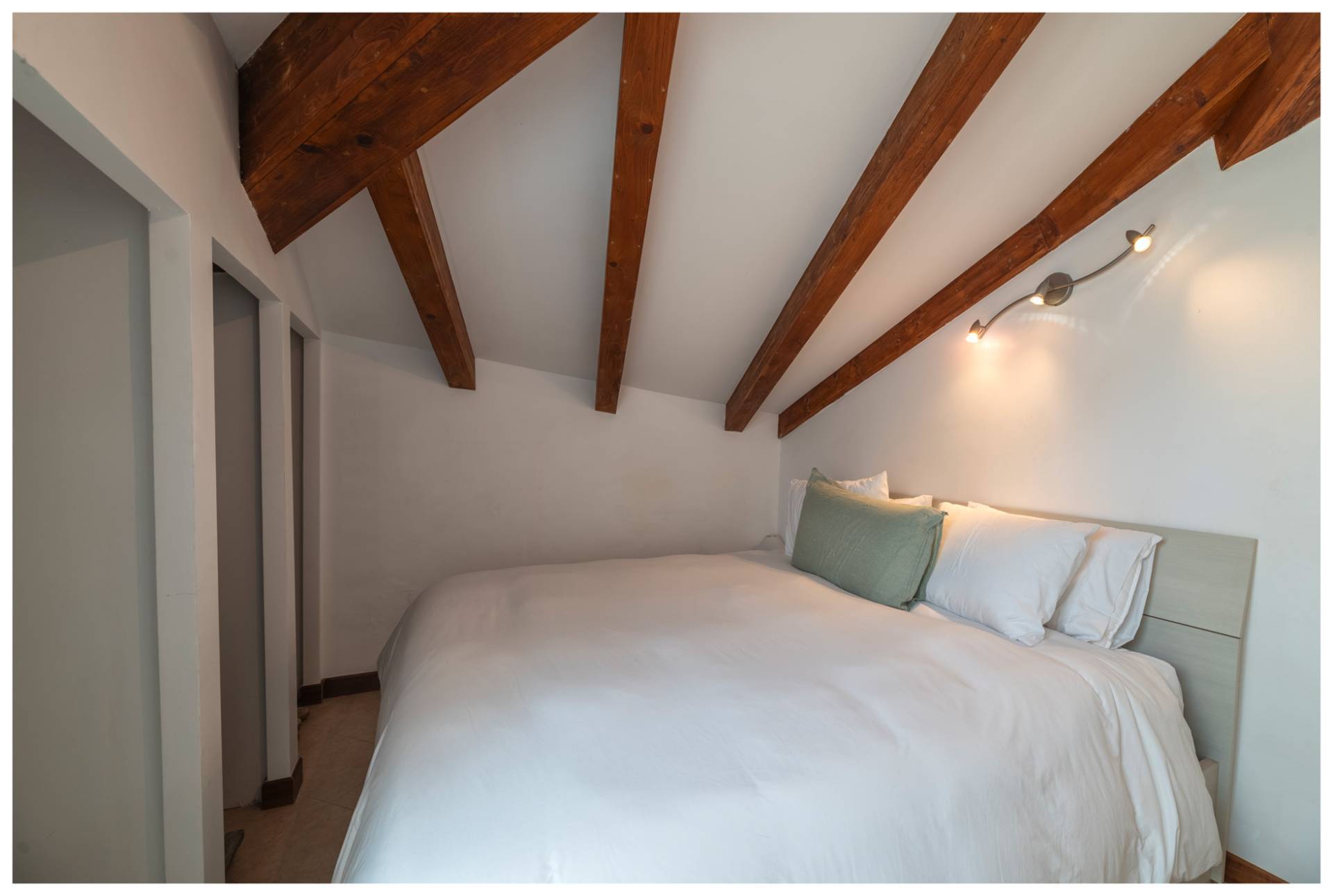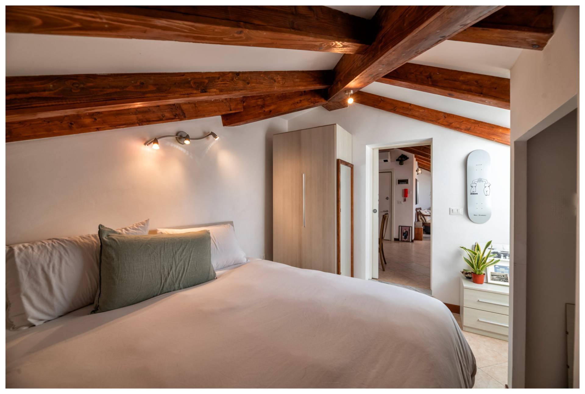 L'alloggio si trova al quarto ed ultimo piano di un condominio anni '50 in buone condizioni generali. Varcata la soglia di ingresso si accede al soggiorno con cucina a vista. Proseguendo si trova la camera da letto matrimoniale e il bagno.